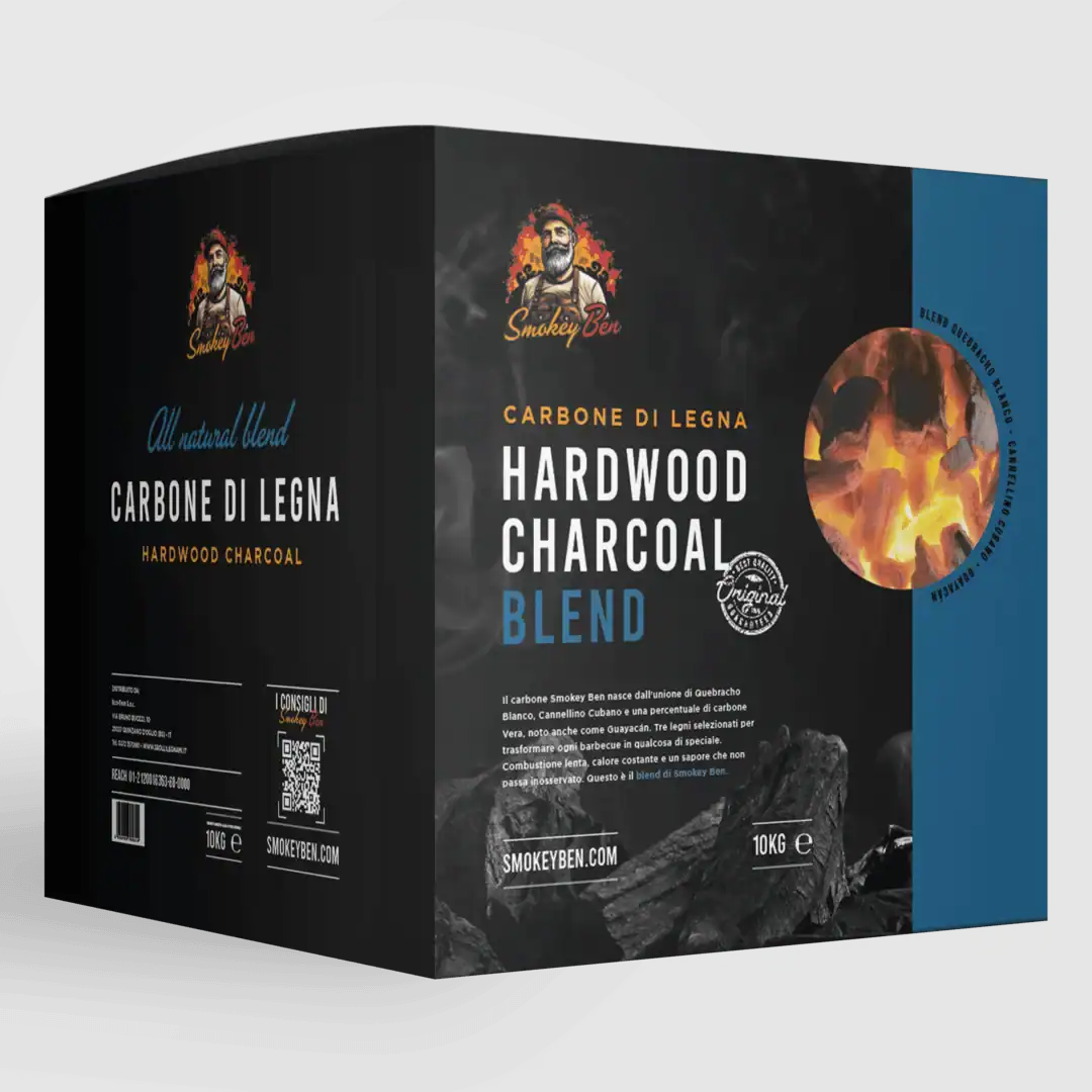 Il carbone di Smokey Ben è ottenuto da una miscela studiata di Quebracho Blanco e Cannellino Cubano, essenze selezionate per dare al barbecue una resa superiore. Brucia lentamente, mantiene una temperatura stabile e regala una nota aromatica decisa che accompagna ogni cottura. Questo è il carattere del blend firmato Smokey Ben.